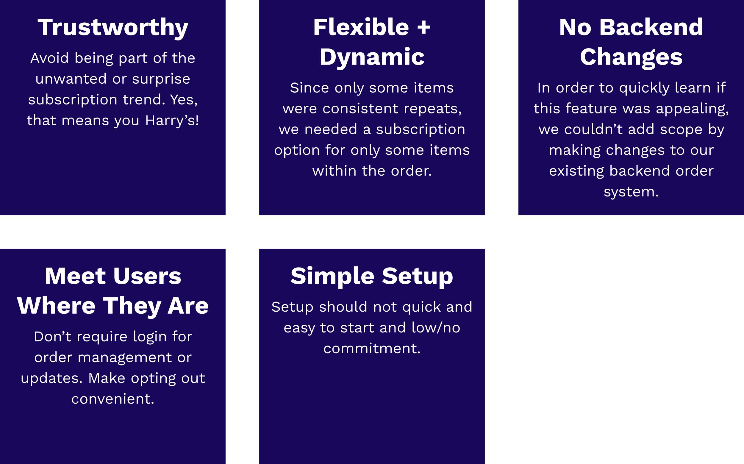 For this project there were endless ways to answer the ‘how might we’ statement. Should we follow competitors examples and offer subscription to specific items? How flexible should our subscription be?